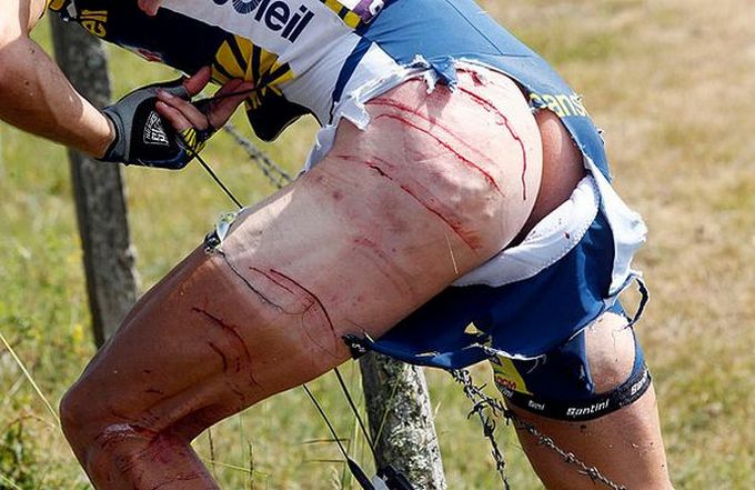 Наверное, самое известное подобное бедствие случилось с испанцем Хуаном Антонио Флеха и голландцем Джонни Хугерландом в 2011 году, которых угораздило сначала столкнуться с машиной, которая сопровождает гонщиков, а затем упасть, наверное, на самый неподходящий для этого предмет – забор с колючей проволокой. Что из этого вышло – смотрите сами. Заметим только одно – голландец отделался самым меньшим уроном из всех возможных и смог даже продолжить гонку.