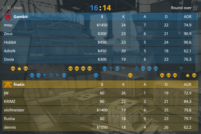 Первая карта встречи — de_train. Первые три раунды берут Gambit. Следующий раунд уходит в актив Fnatic. Шведы выигрывают последующие пять выходов подряд, счёт становится 3:6. Gambit Gaming удаётся взять несколько розыгрышей и закончить половину со счётом 7:8. Второй пистолетный раунд остаётся за коллективом из СНГ. Команды размениваются раундами. После счёта 15:14, ребята с Gambit забирают победный раунд, - 16:14.