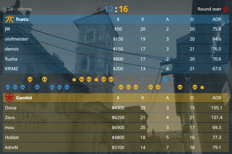 Картой номер два, которая может стать победной для СНГ-коллектива, становится - de_inferno. Вновь первые три раунда уходят нашему коллективу. Та же история с первым оружейным, - раунд в копилку шведов. Форсированный бай от последних приносит им второй раунд. «Форс» в ответ, и счёт 5-2. Камбек в первой половине от Fnatic, счёт 7-8 для команды из Швеции. Четвёртая пистолетка за Даниилом и ко. Очень напряженная и близкая игра от команд, но все же Gambit Gaming дожимают шведов. Победа со счётом 16:12. Итоговый счёт противостояния — 2:0. Поздравляем!