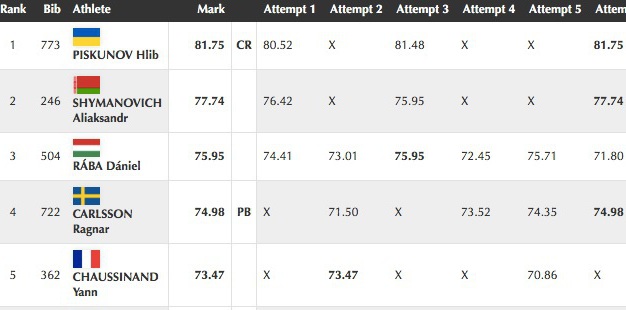 Второе место с результатом 77,74 метра занял белорус Александр Шиманович, бронзовую награду для Венгрии добыл Даниэль Раба.
