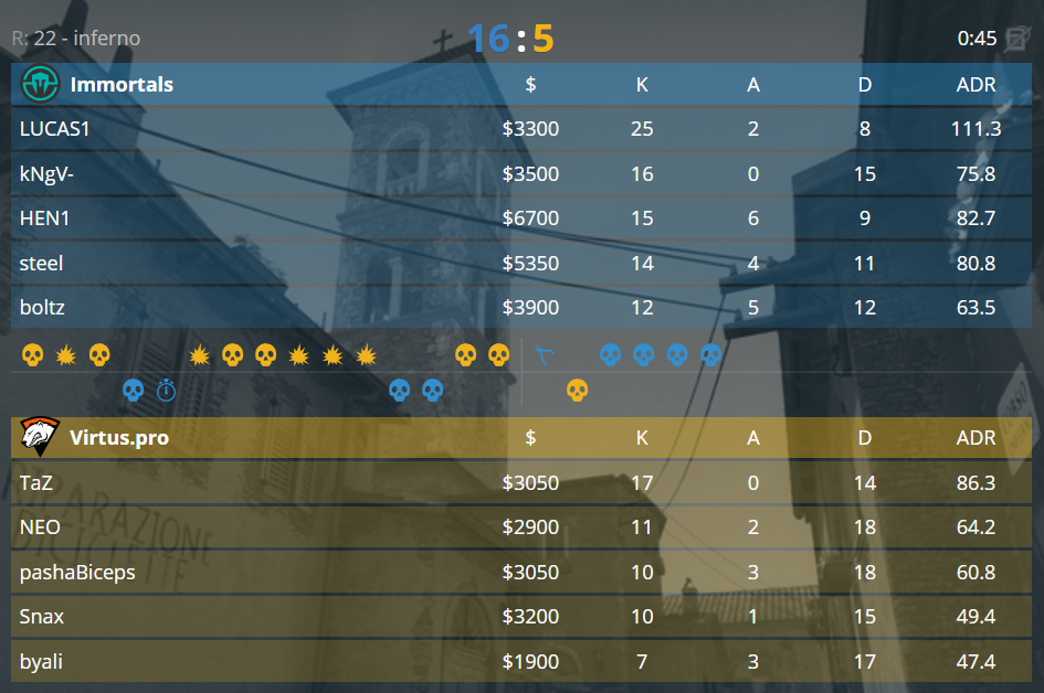 Первая карта серии - de_inferno, смотрим за началом матча, - первые раунды за «бессмертными», - 3:0. Сильная атака, поляки ничего не могут сделать, 8:2. Победа в первой половине за бразильцами, 11:4. Вторая половина не дает возможность показать свою игру парням из VP, они отдают пик противников, взяв только 1 раунд. Победа за Immortals, - 16:5. Счёт серии 1-0.