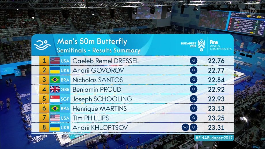 Украинский пловец Андрей Говоров квалифицировался в финал чемпионата мира по водным видам спорта, который проходит в Будапеште. На своей «коронной» дистанции 50 метров баттерфляем Говоров показал второй результат в полуфиналах, всего на 1 сотую секунды уступив американцу Калебу Дресселу.