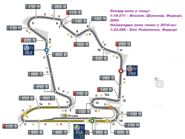 кваліфікація: 1:18.773 (2010, Себастьян Феттель) гонка: 1:19.071 (2004, Міхаель Шумахер) |