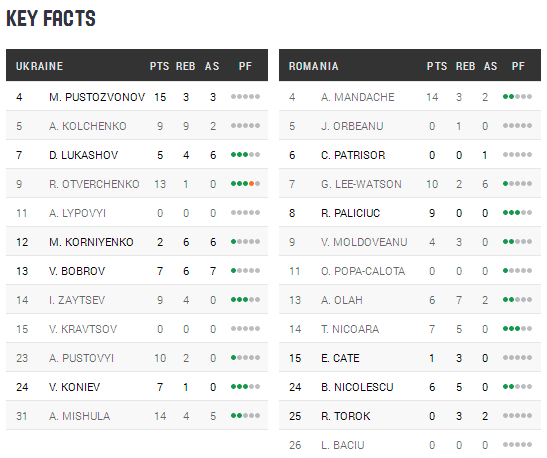 Україна: Пустозвонов – 15 очок, 3 підбирання; Мішула – 14 очок, 4 підбирання.
