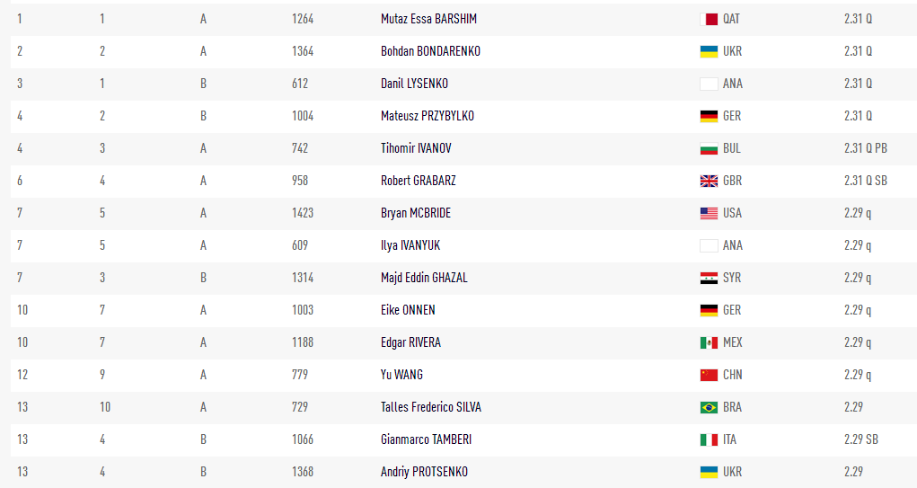 Еще один украинец Андрей Проценко остановился в шаге от финала, преодолев высоту 2,29 м со второго раза и не взяв 2,31. Учитывая, что 2,29 м смогли взять сразу 17 спортсменов, в зачет пошли неудачные попытки на предыдущих высотах.