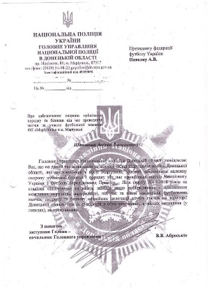 За словами Аброськіна, наявний склад підрозділів національної поліції в Маріуполі готовий вжити всіх необхідних заходів «щодо попередження і припинення можливих порушень напередодні , під час та після закінчення футбольних матчів, охорону та безпеку офіційних делегацій клубів гостей на території Донецької області при їх супроводі в обох напрямках, в місцях мешкання, на тренуваннях», - йдеться в його листі до президента ФФУ.