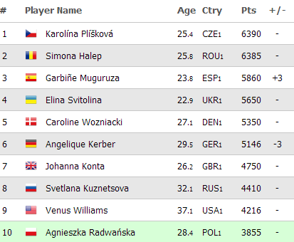 Возглавляет рейтинг лучших теннисисток планеты представительница Чехии Каролина Плишкова, ей «дышит в спину» румынка Симона Халеп (разрыв между 1 и 2 местом всего 5 очков). На третье место поднялась победительница турнира Western & Southern Open испанка Гарбинье Мугуруса.
