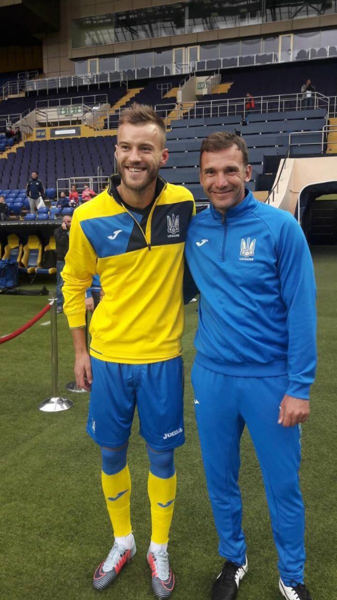 До речі, це вперше, коли великий трансфер гравця збірної припав на збори команди. Ярмола відповідально сам зафрахтував літак з Києва, щоби не пропустити відкрите тренування на «Металісті». Це про нього Шевченко говорив на пресусі, коли згадав про відношення футболістів до справи. До речі, я виграв перегони в інтернеті: хто зробить і виставить першу фотку Шеви і Ярмоли, тепер уже гравця Боруссії. Ось ця світлина зібрала близько 10 тисяч переглядів і півтори тисячі лайків. На телефон знімав свій.