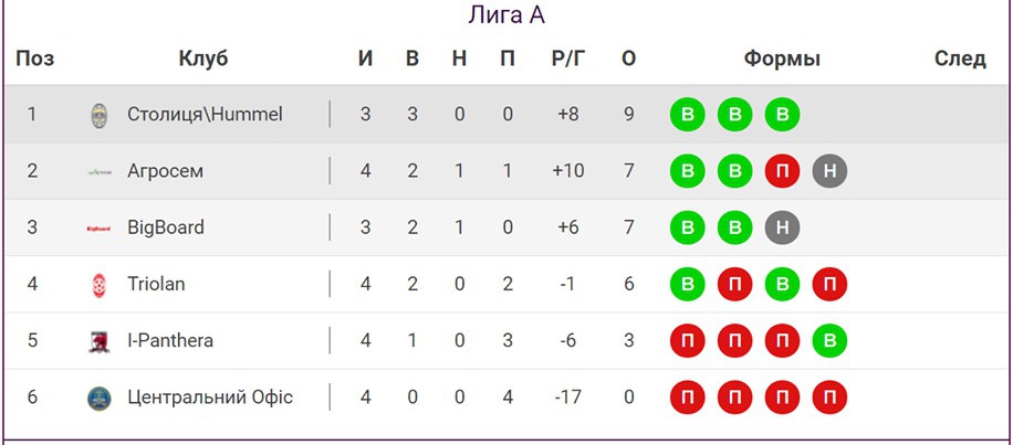 В лиге «А» Corporate league лидирует «Столица», добывшая три победы в трех сыгранных матчах. Матч четвертого тура против делящей второе-третье место с «Агросемом» команды «BigBoard» сыгран позже.