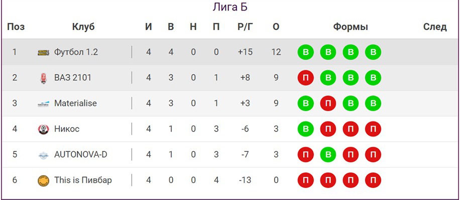 На три очка отстают от «футболов» команды ВАЗ 2101 и «Materialise», набравшие по 9 очков в четырех матчах.