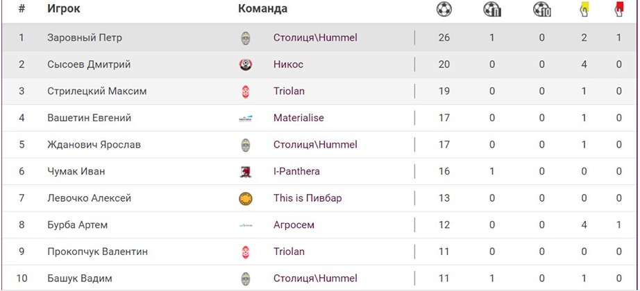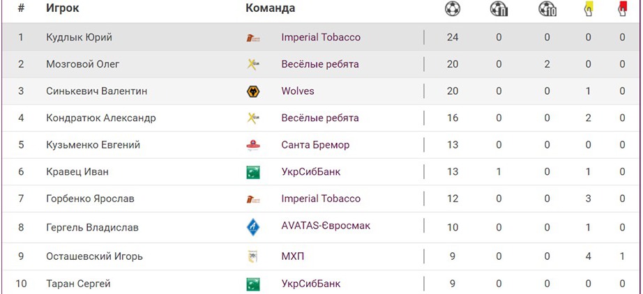 В списке бомбардиров продолжает лидировать Юрий Кудлык из «Imperial Tobacco», забивший 24 мяча. Дышат в спину ему Олег Мозговой из «Веселых ребят» и игрок «Волков» Валентин Синькевич, записавшие в личный актив по 20 голов.