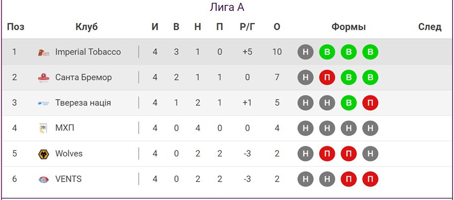 Все матчи четвертого тура лиги «А» были сыграны вничью, поэтому безоговорочным лидером по-прежнему является команда «Imperial Tobacco», имеющая десять очков в активе. Дышит в спину им «Санта Бремор», у которой две победы, одна ничья и одно поражение. «Твереза нація» с пятью очками занимает третье место в турнирной таблице.