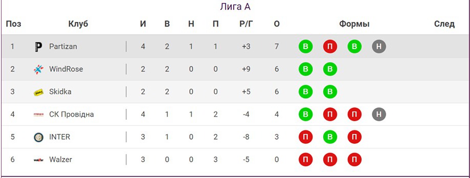 Лидерство в Лиге «А» благодаря победе перехватил «Partizan», имеющий в активе семь очков. Второе и третье места делят «WindRose» и «Skidka», набравшие максимум очков за два сыгранных матча – по 6. Эти команды имеют два матча в запасе, так что лидерство «Партизана» продлится до ближайшей встречи главных фаворитов лиги. Отметим, что «Inter» и «Walzer», расположившиеся на двух последних строчках таблицы, имеют по матчу в запасе.