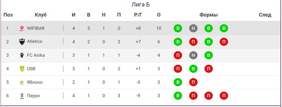После четырех туров в Лиге «Б» лидирует команда WIFIBAR с 10 очками в активе. Отметим, что на одну игру меньше сыграли FC «Anika» и USB. Они имеют по матчу в запасе, который позже сыграют «Яблоком».