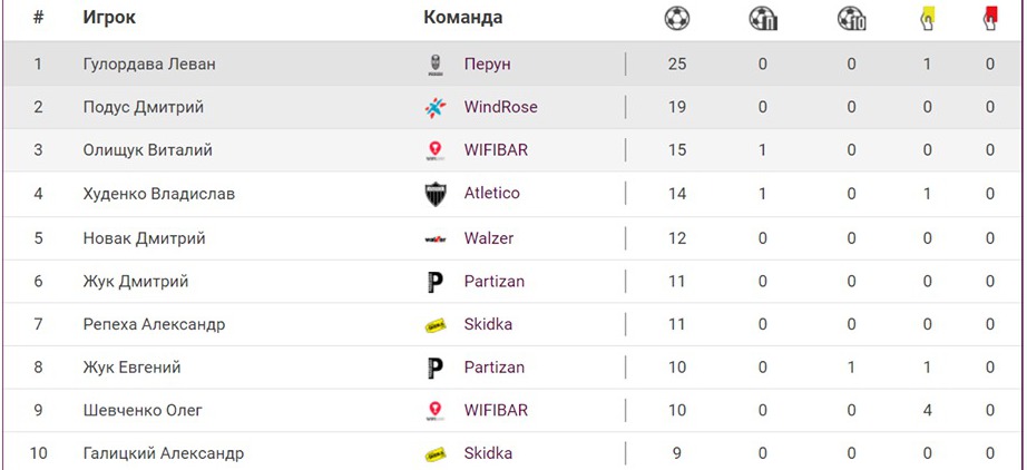 В гонке бомбардиров больше всего голов (25) по-прежнему в активе у известного футболиста «Перуна» Левана Гулордавы. Перевес над Дмитрием Подусом из команды «WindRose» составляет 6 голов.