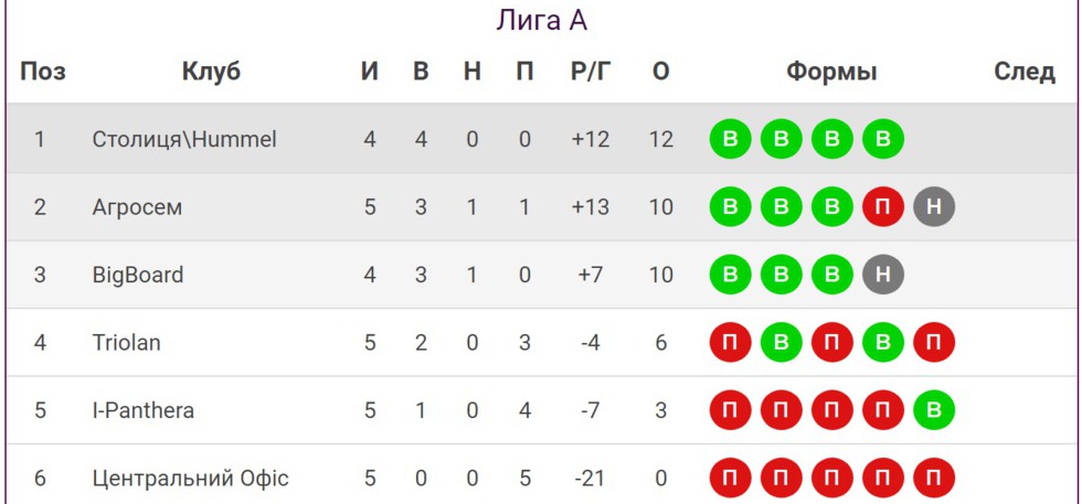 Безоговорочным лидером Лиги «А» является «Imperial Tobacco». Четыре из пяти поединков команда выиграла и имеет 13 очков в активе. Дышат в спину им «Санта Бремор», у которых 10 пунктов. VENTS и «Твереза нація» с пятью очками делят третье место в турнирной таблице.