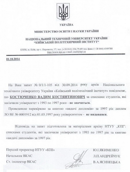 Согласно документам, которые предоставили в КПИ, Вадим Костюченко не получал диплом этого ВУЗа