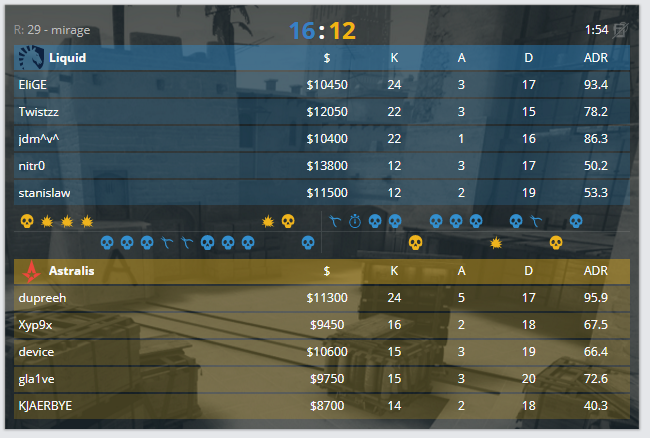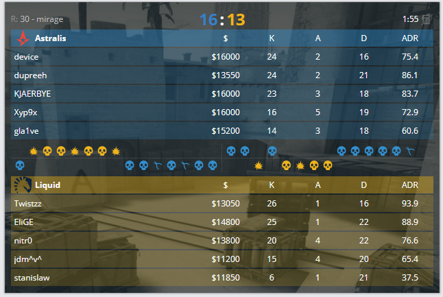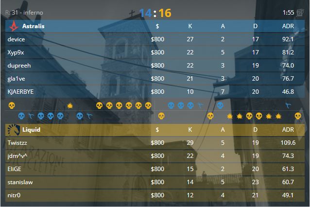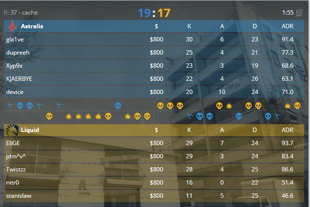 Последней парой «за выживание» стали «жидкие» и «астралы», картами стали: de_inferno, de_cache и de_mirage. Очень напряженная и близкая игра от коллективов закончилась со счётом 16-14 для «жидких». Вторая карта была изумительно-валидольная для фанатов обеих команд, и закончилась она дополнительными раундами и победой датского коллектива, 19-17. «Мираж» не оставил камня на камне от нервов абсолютно всех, еще одна напряжённая игра и победа Team Liquid, 16-12