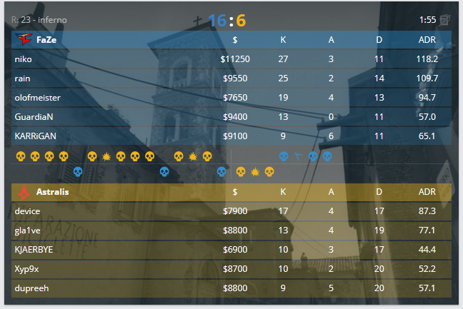 Та же история в группе В, Faze – Astralis, карта для борьбы - de_inferno. Толи сильная игра от rain и ко, или же слабая игра от оппонента, - поражение для датского коллектива, с разгромными 16-6.