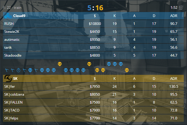 Сошлась пара победителей группы А, - SK Gaming и С9. Очень сильная карта от бразильской пятёрки, - de_train. И минимальное сопротивление от номинальных хозяев, 16-5.