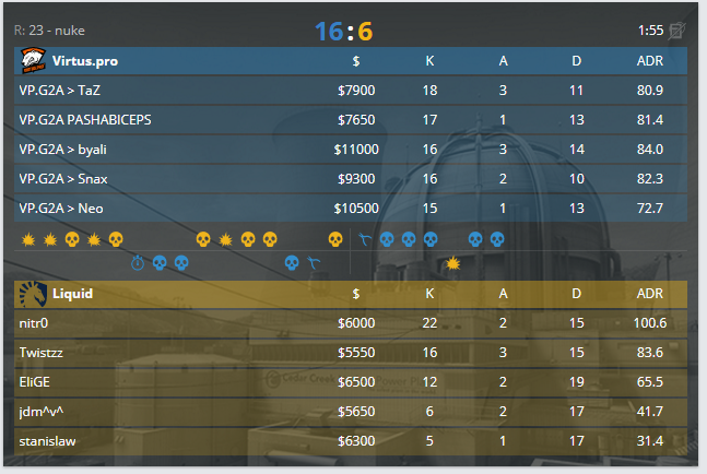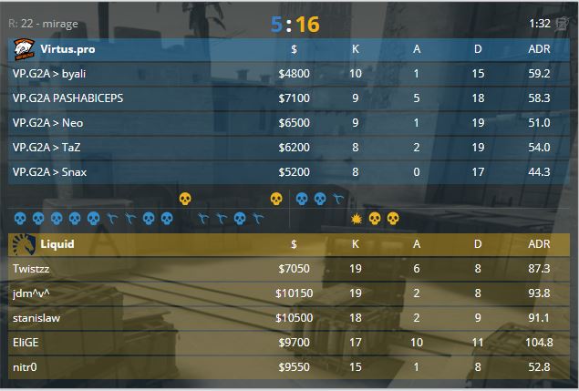Вторая же пара: Virtus.Pro - Team Liquid разыграли все три карты серии: de_inferno, de_nuke и de_mirage. Первую локацию (de_inferno) выиграли американцы, 16-10. Вторая мапа (de_nuke) ушла полякам, 16-6. Третья карта (de_mirage) шла под диктовку команды из Америки, и закончилась в их пользу, 16-5.