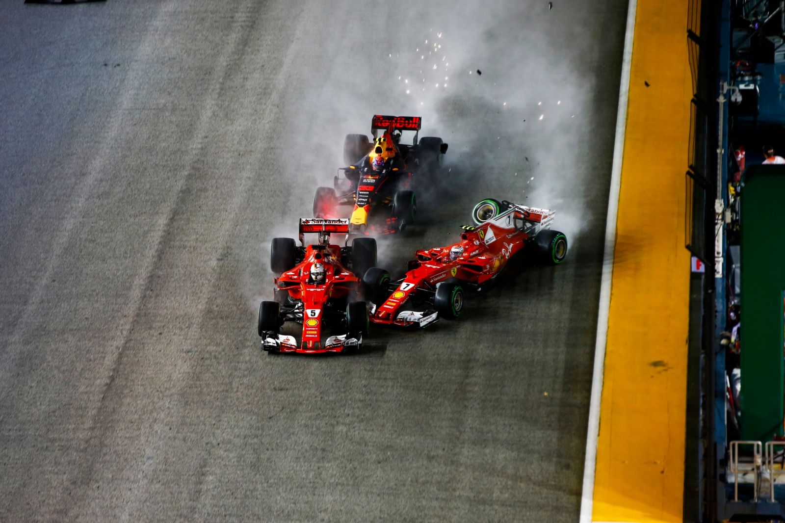 Старт гонки перетворився на справжнісіньке жахіття для Феррарі та, можливо, крах чемпіонських шансів Себастьяна: після того як червоні ліхтарі згасли Феттель рушив з місця трошки гірше за Ферстаппена, позаду якого ракетою вискочив Райкконен, поки німець намагався захистити позицію, зміщаючись ліворуч, то на Макса з іншого боку тиснув Кімі. Взявши Ред Булл в бутерброд обоє пілотів Феррарі на слизькому асфальті не зуміли уникнути непоправного й зіткнулися – спочатку з машиною Макса, потім між собою!