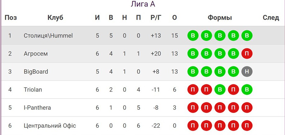 В лиге «А» Corporate league лидирует «Столица», добывшая пять побед в пяти сыгранных матчах. Матч шестого тура против делящей второе-третье место с «Агросемом» команды «BigBoard» будет сыгран позже.