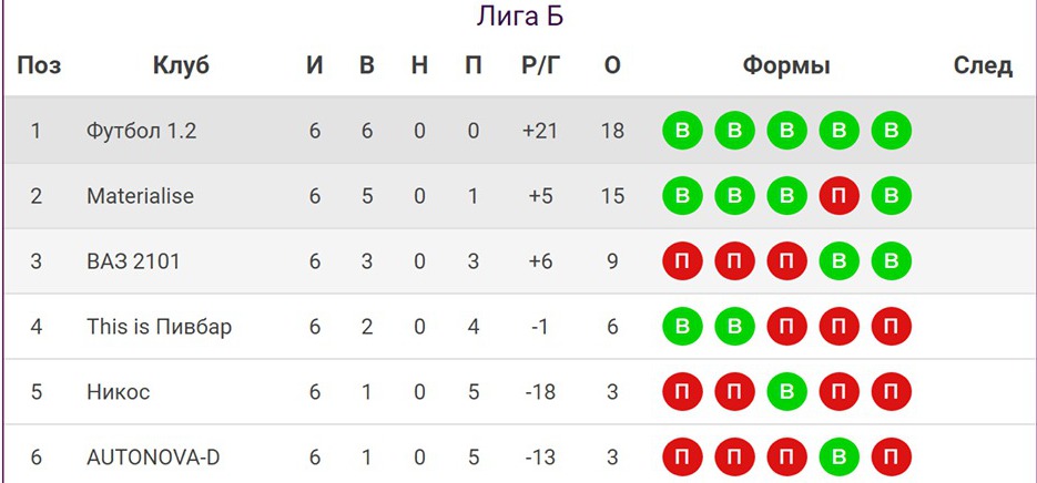 Турнирная таблица. Premier league. Лига «Б»