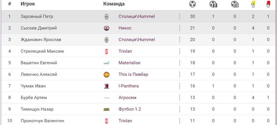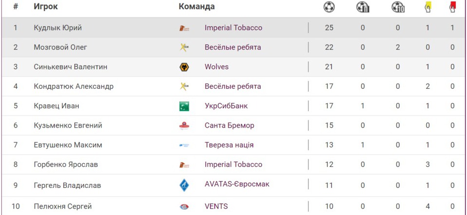 В списке бомбардиров продолжает лидировать Юрий Кудлык из «Imperial Tobacco», забивший 25 мячей. Дышат в спину ему Олег Мозговой из «Веселых ребят» и игрок «Волков» Валентин Синькевич, записавшие в личный актив 22 и 21 голов соответственно.