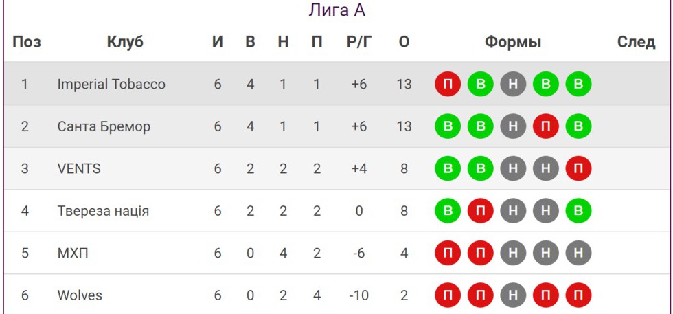 Лидерами Лиги «А» являются «Imperial Tobacco» и «Санта Бремор». Четыре из шести поединков команды выиграли и имеют по 13 очков в активе. Дышат в спину им VENTS и «Твереза нація», которые с восемью очками делят третье место в турнирной таблице.