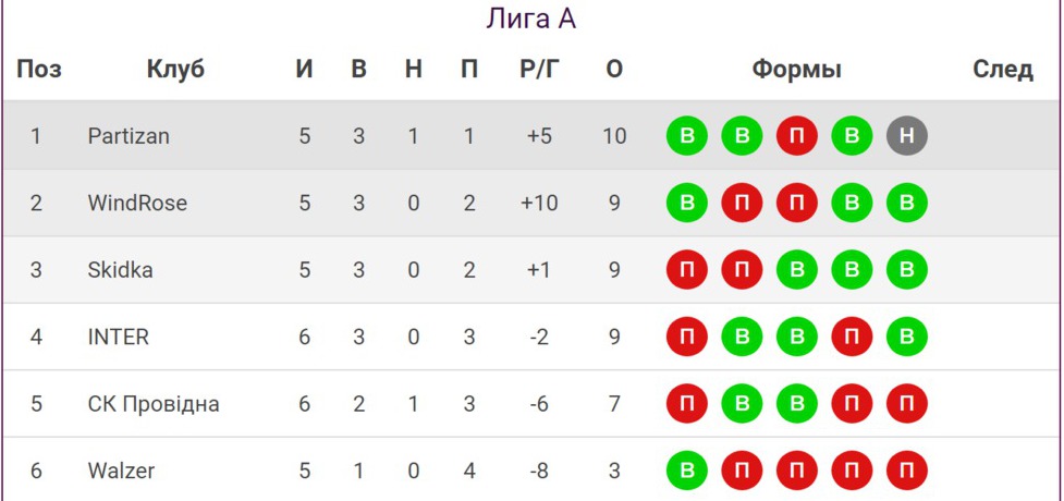 Лидерство в Лиге «А» благодаря победе над «Скидкой» перехватил «Partizan», имеющий 10 очков. На 1 пункт меньше в активе у команд «WindRose», «Skidka» и «Inter», которые делят второе-четвертое места в турнирной таблице.