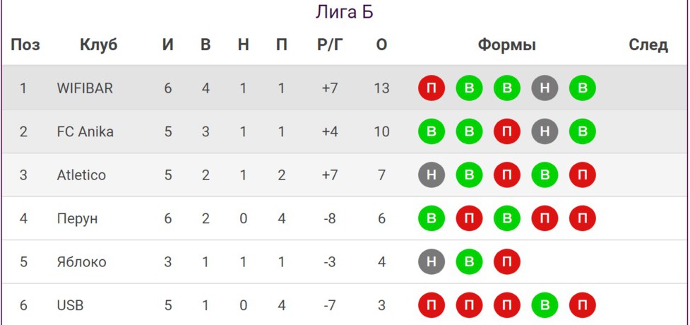В Лиге «Б», несмотря на поражение от аутсайдера, продолжает лидировать команда WIFIBAR с 13 очками в активе. На второе место вышла FC «Anika», набравшая 10 пунктов, а замыкает Топ-3 с отставанием в 6 очков от лидера «Atletico». Отметим, что FC «Anika», «Atletico» и USB сыграли на одну игру меньше других команд. Они имеют по матчу в запасе, который позже сыграют «Яблоком».