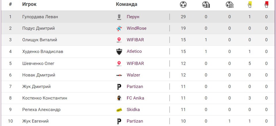 В гонке бомбардиров больше всего голов (29) по-прежнему в активе у известного футболиста «Перуна» Левана Гулордавы. Перевес Дмитрием Подусом из команды «WindRose» составляет 10 забитых мячей.