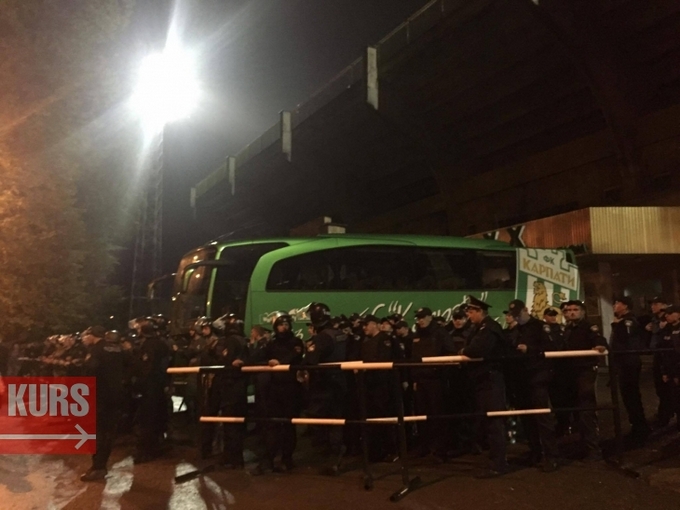 Сотня вболівальників ФК «Карпати» спробували «поговорити» з гравцями команди після матчу 1/16 фіналу Кубку України, в якому «Карпати» програли франківському «Прикарпаттю» (1:2). Щоб не допустити бійки, автобус команди щільно оточили нацгвардійці і поліцейські в бронежилетах і з палицями.