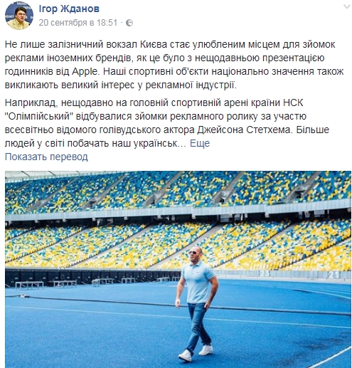 Всемирно известный актер Джейсон Стейтем не был в Киеве и не снимался в рекламном ролике на НСК «Олимпийский», о чем ранее сообщил министр спорта Игорь Жданов и пресс-служба спортивной арены. На самом деле роль «Стейтема» играл украинский парень по имени Антон.