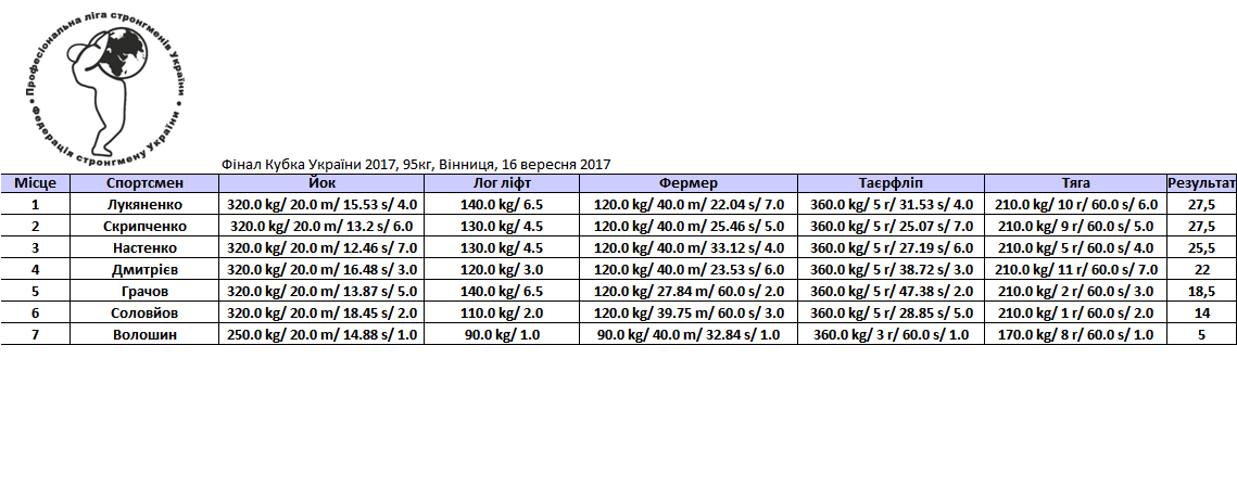 У ваговій категорії до 95 кг напружена боротьба тривала до останньої вправи. Першу дисципліну – «Супер-йок» (320 кг на 20 м) виграв киянин Євген Настенко. Однак після двох наступних випробувань на першу позицію вийшов екс-вінничанин Богдан Лук’яненко, котрий зараз мешкає у столиці. Щоправда, непереконливий виступ Богдана у «Кантуванні колеса» (4-е місце), дозволив вискочити на перше місце молодому силачу з Мелітополя Олександру Скрипченку. Однак Лук’яненко зумів перемогти опонента в очній дуелі у вправі «Тяга Акселя» (210 кг за 60 секунд) – 10 тяг проти 9. При рівності очок у загальному заліку, до уваги береться число перемог в окремих вправах, а за цим показником Богдан Лук’яненко мав перевагу, тому саме він здобув Кубок України! Третє місце залишив за собою Настенко.