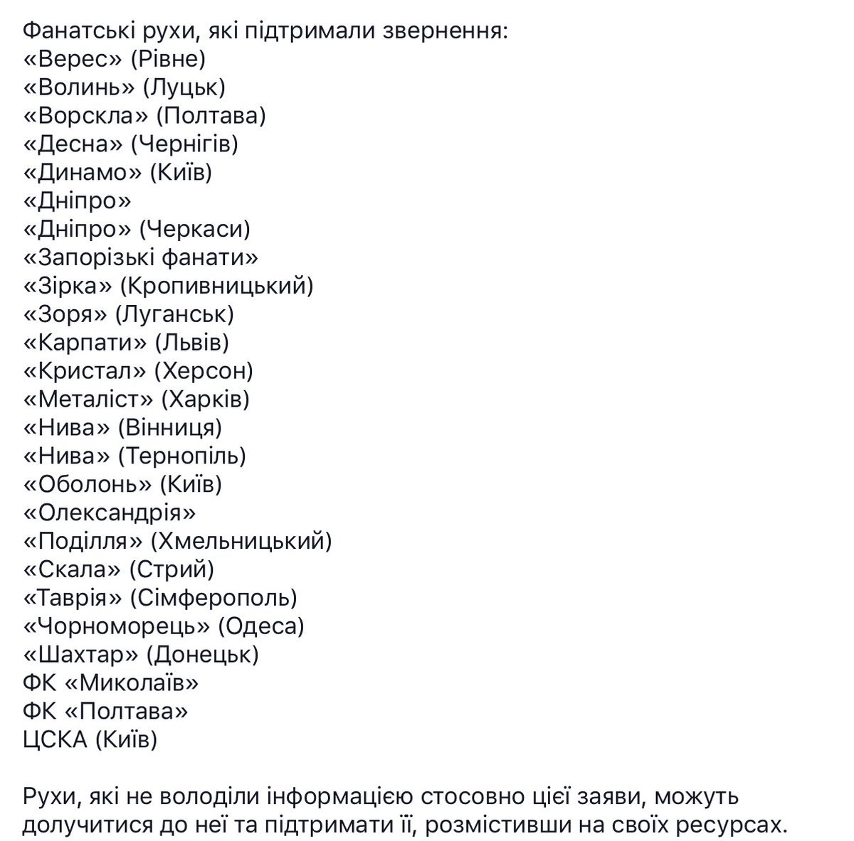 Звернення підтримали фанатські рухи 25 українських команд, в тому числі «Динамо», «Шахтаря», «Карпат», «Чорноморця», «Ворскли» та інших.