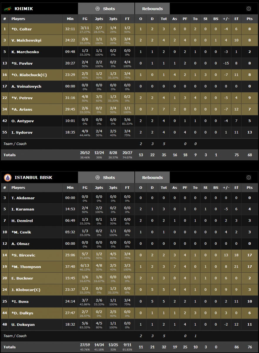 «Хімік» (Україна) – «Істанбул» (Туреччина) – 68:76 (16:22, 15:14, 19:22, 18:18) - перший матч 90:89