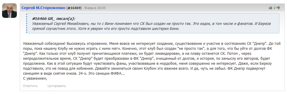 Как в этой ситуации будут чувствовать фаны, которые участвовали в мордобое, меня совершенно не интересует. Даже, если Березу подставили, это не повод для избиения. Давайте заниматься своим клубом. Это важнее всего. И да, чуть не забыл. ФК «Днепр» подвергнут санкциям в виде снятия очков. 24-х. Это санкции ФИФА», - написал на форуме официального сайта харьковчан Стороженко.