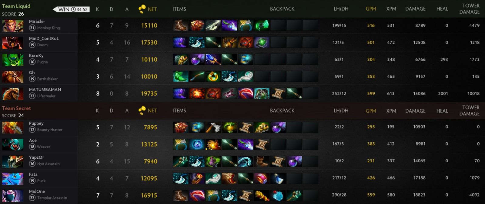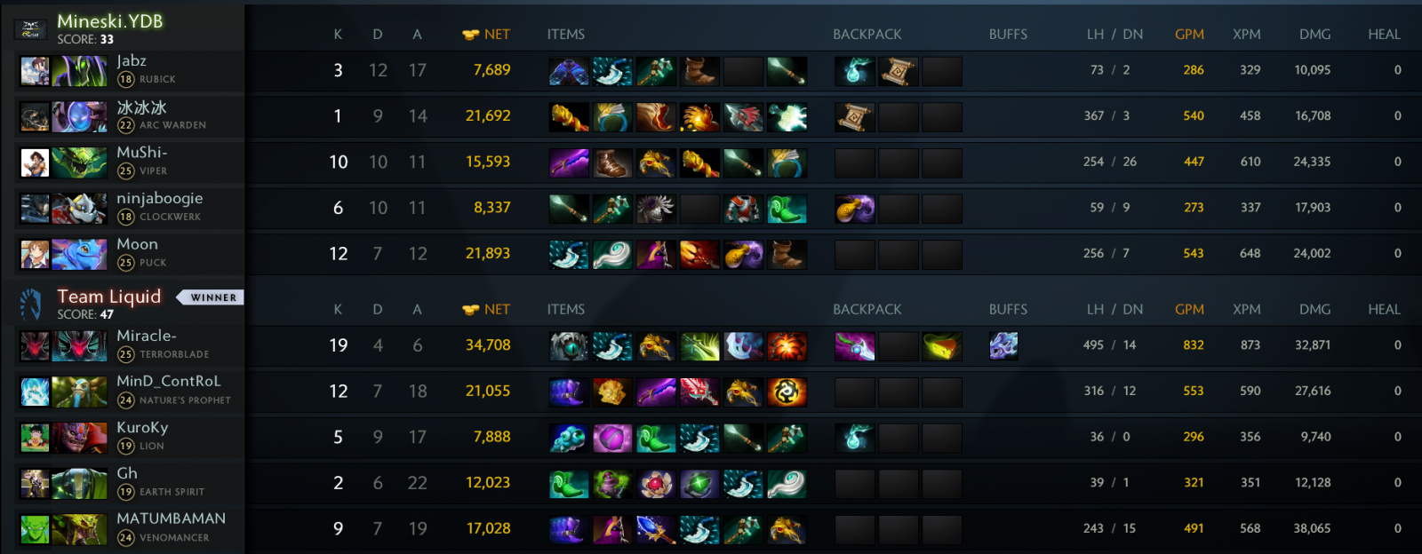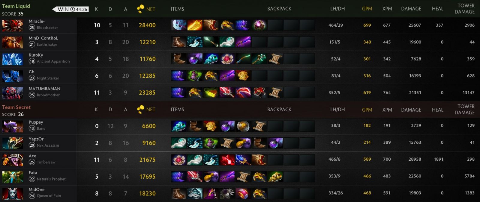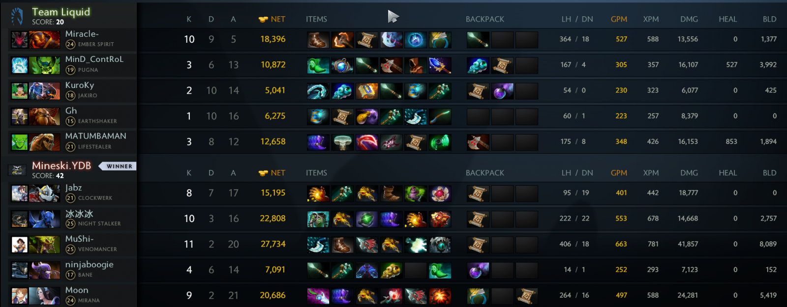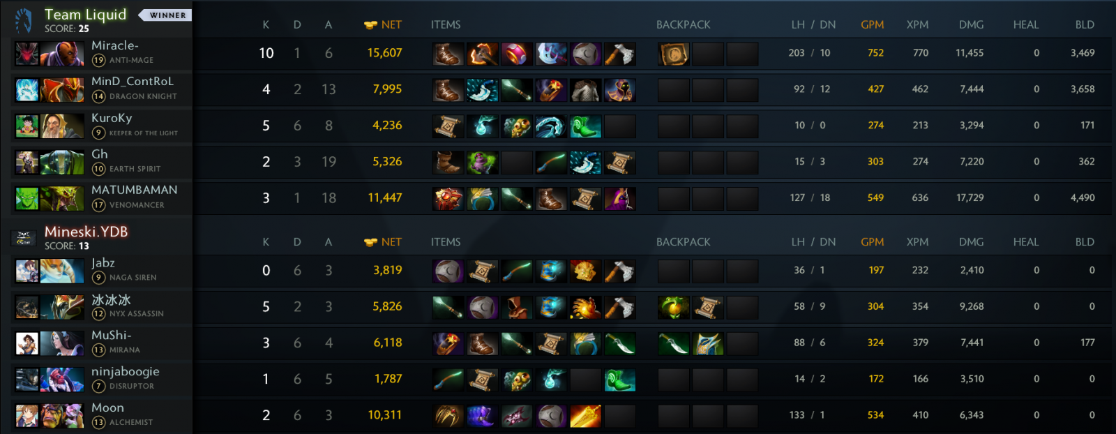 Финальное бест оф 5 началось для коллективов с выбора следующих героев: Team Liquid: Шейкер, Пугна, Джакиро, Лайфстиллер и Ембер Спирит, в ответ Mineski: Веномансер, Найт Сталкер, Клокверк, Бейн и Мирана. Нереальное исполнение от юго-восточного коллектива, 1-0.