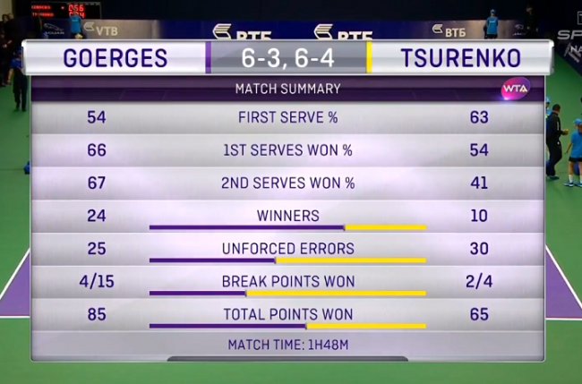 Вторая партия шла ровнее, чем первая, и Леся смогла сравнять счет в восьмом гейме. К сожалению, следующую свою подачу она защитить не смогла. Гергес оставалось подать на матч, что она и сделала.