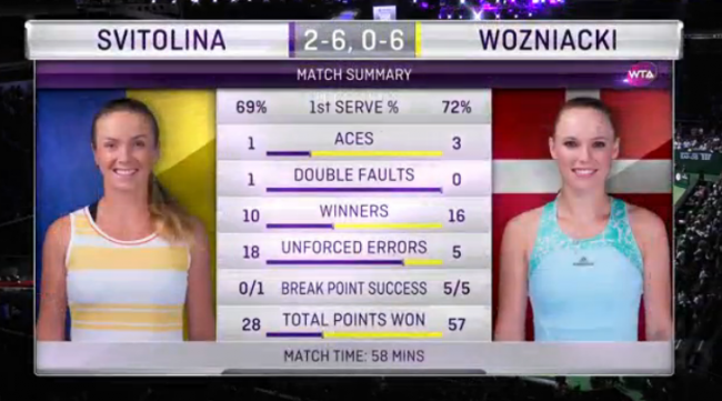 Элина Свитолина (Украина) – Каролин Возняцки (Дания) – 2:6, 0:6.
