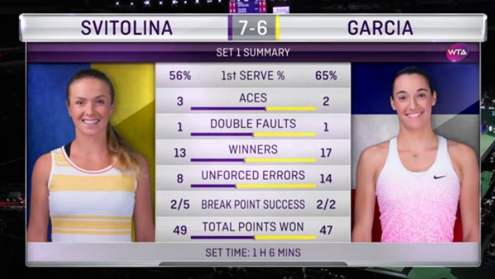 Тай-брейк украинка начала со счета 0:4, но смогла выиграть следующие 5 из 6 розыгрышей, а чуть позже отыграла 2 сетбола – 7:7. А вот свой сетбол Элина реализовала с первого раза. Браво, хотя без помощи Гарсии не обошлось