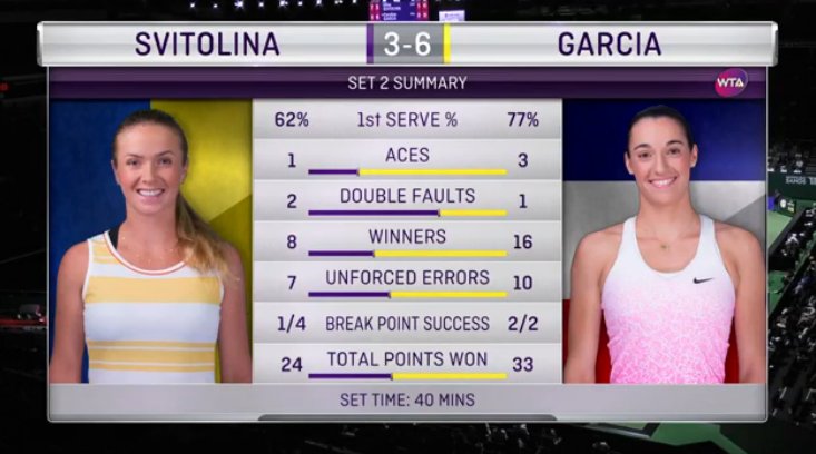 Во втором сете первый результативный ход сделала уже Свитолина. В третьем гейме украинка, воспользовавшись ошибкой француженки при счете 40:40, заработала брейкпоинт и незамедлительно его реализовала. Но уже в следующем гейме счет сравнялся, а после этого у Элины случился провал, и она проиграла еще 3 очка. В 9 гейме Гарсия отыграла тройной брейк-пойнт Свитолиной и заслужено выиграла вторую партию.