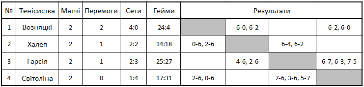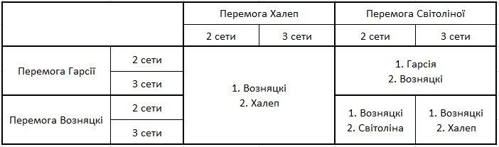Для виходу Світоліної в півфінал потрібні наступні умови: перемога українки над румункою в 2 сетах і будь-яка перемога Возняцкі над Гарсією. Всі можливі варіанти приведені у таблиці нижче.
