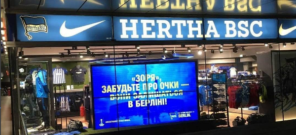 Первое, что увидят Вернидуб и компания в аэропорту Берлина – экран с надписью по-украински в витрине фирменного клубного магазина: «Зоря, забудьте про очки — вони залишаться в Берліні».