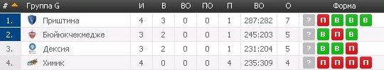 Даже в случае побед в двух оставшихся матчах «Химик» не имеет абсолютно никаких шансов на проход в следующую стадию, поскольку вторая команда в группе одержит минимум три выигрыша («Монс» и «Бююкчекмедже», у которых по две победы, проведут личную встречу).