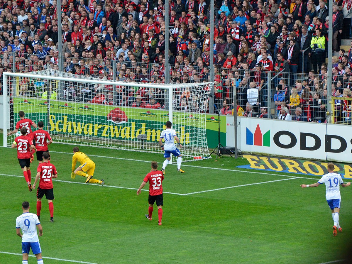Ответ «Фрайбурга» стал не менее впечатляющим: с ударом Майка Франтца в красивом прыжке справился Ральф Фарманн, а вот с добиванием Нильса Петерсена – только крестовина ворот. Еще через пару минут неберущийся удар нанес польский легионер хозяев Бартош Капустка – и снова на помощь «Шальке» пришел каркас ворот, поскольку мяч угодил в перекладину. Так что по опасным моментам хозяева выиграли первый тайм, однако свисток на перерыв зафиксировал, что счет так и не был открыт.