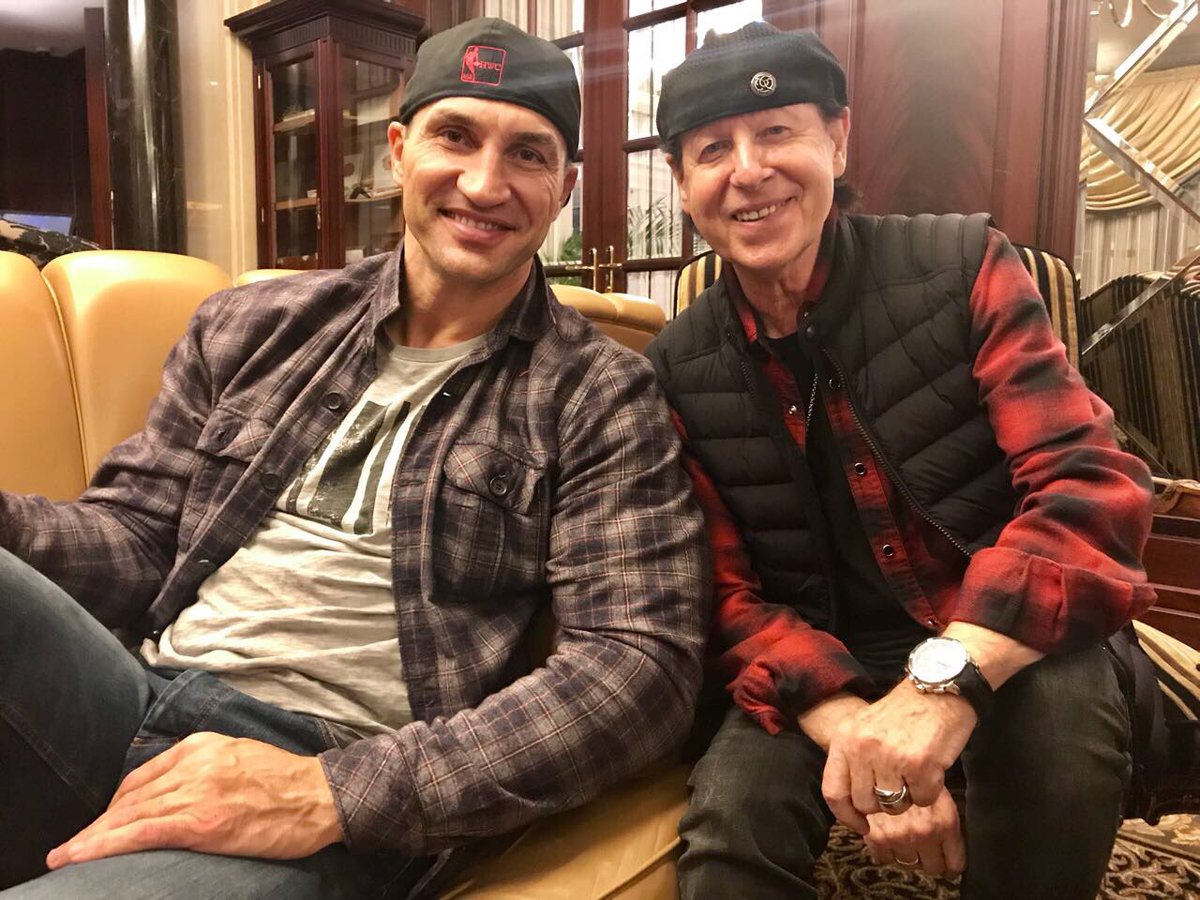 Двукратный чемпион мира по боксу в супертяжелом весе Владимир Кличко разместил на своей странице в Твиттере фото с фронтменом легендарной немецкой группы Scorpions Клаусом Майне.