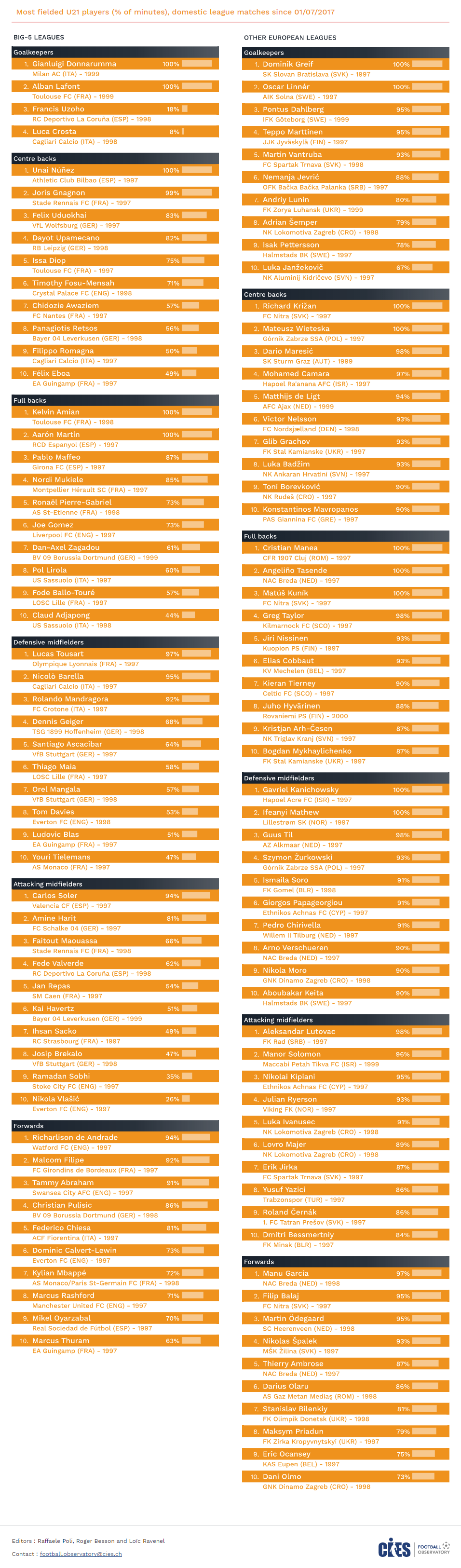 У відповідному рейтингу гравці поділені за позиціями. Серед європейських Ліг (топ-31) найрясніше представлена французька: 19 її виконавців увійшли до списку найперспективніших. Далі йдуть Нідерланди, Словаччина, Хорватія та Українська Прем’єр-ліга з п’ятьма футболістами!